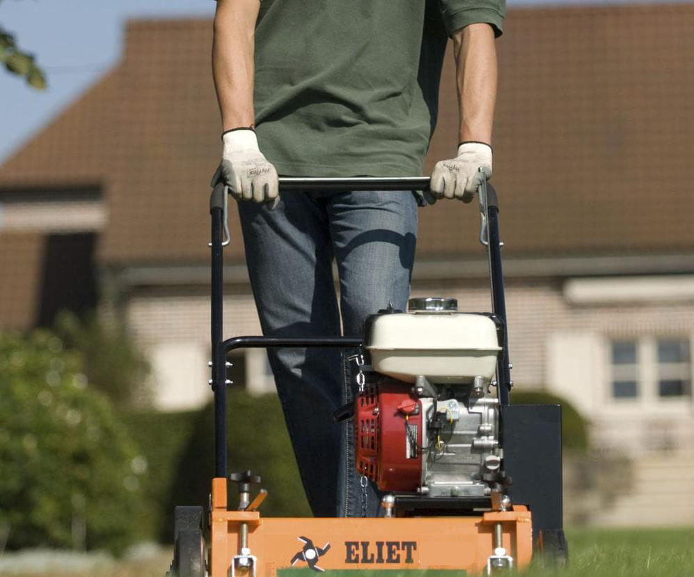 El ajuste preciso de la profundidad es esencial para minimizar el daño al césped y evitar el desgaste innecesario de las cuchillas. Cada una de las ruedas delanteras del ELIET E 750 tiene un ajustador de profundidad individual. Esto le permite ajustarse a la profundidad de las cuchillas dentro de 1 mm y garantizar que todo el eje de la cuchilla esté en contacto con el suelo.